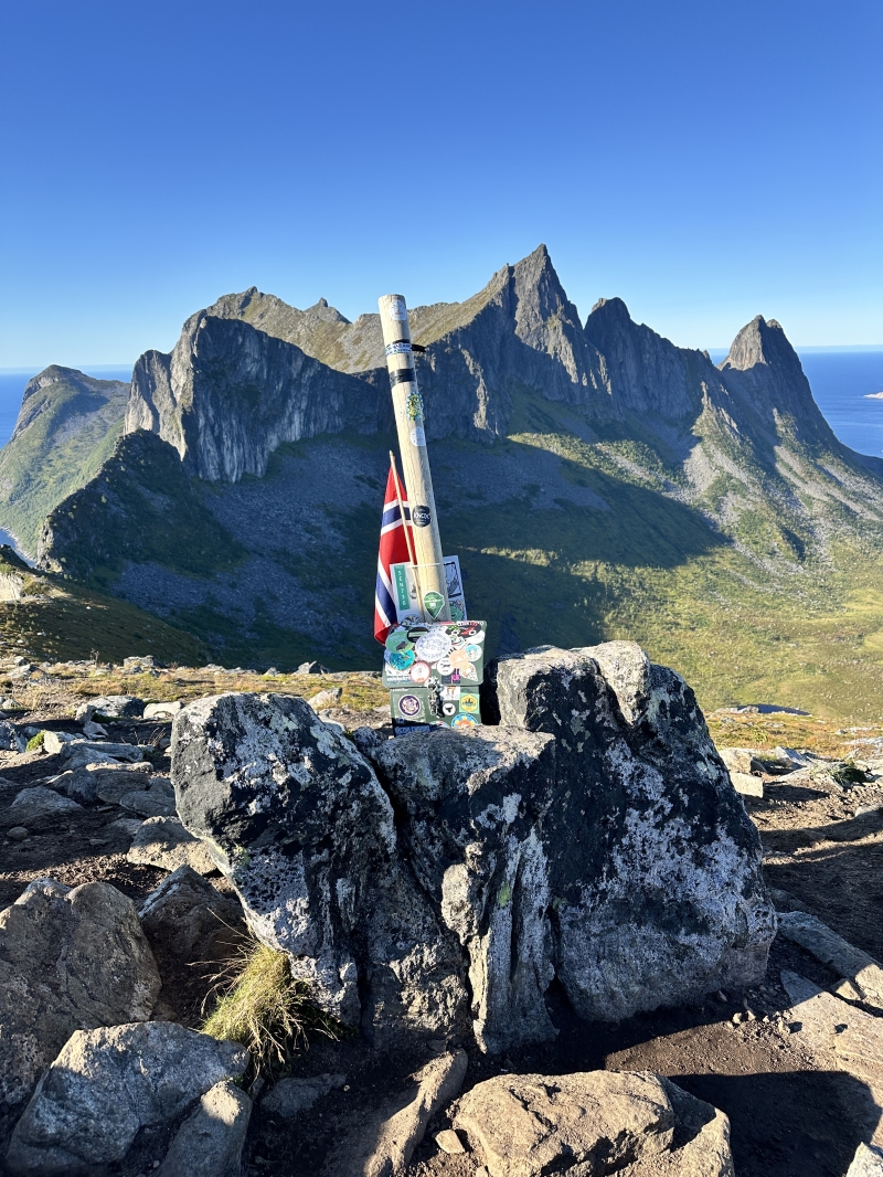 Tok på meg ryggsekken og gikk oppover til et punkt hvor man må velge å gå til Hesten eller Segla. De lokale kaller det Sinsenkrysset. Vi skulle jo uansett gå begge så litt tilfeldig valgte vi Segla først. Kom ganske snart til noe som ble kaldt Brorbua. Han som hadde bygd bua med kone satt der akkurat da, så det ble en hyggelig prat med dem. Vi fortsatt så videre et stykke på tilrettelagte planker før vi kom til løvskog og bratt stigning. Kom så til en liten toppflate kalt Heia hvor vi begynte på den siste, lange, bratte stigningen til Segla. Været var nydelig hele tiden. Fantastisk utsikt på toppen. Etter litt bildetakning og en pause ruslet vi ned igjen til Sinsenkrysset og valgte ruta opp til Hesten. Denne var lettere og mer folksom. Det tok ikke lang tid før vi var på toppen og hadde fantastisk utsikt mot Segla som vi var på for noen timer siden. På andre siden hadde vi like nydelig utsikt mot Inste Kongen og Svartvasstinden. Etter at bildene var tatt ruslet vi raskt ned igjen til bilen svært fornøyde etter en fantastisk tur.